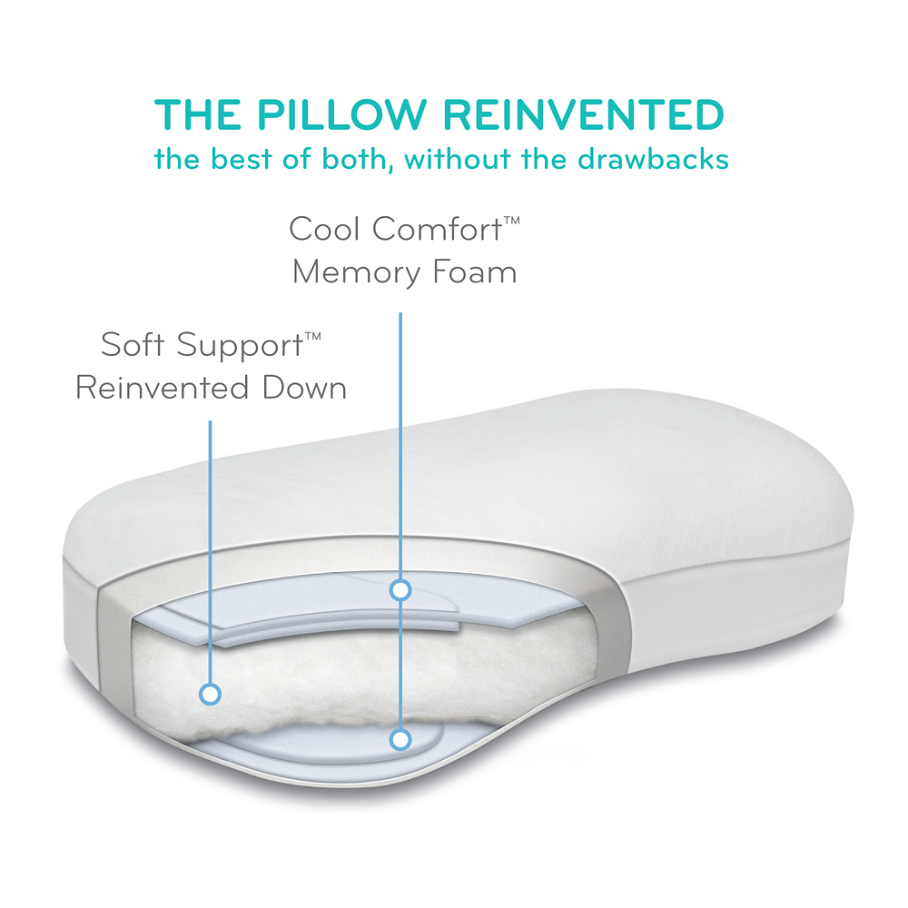 The Soft Support™ Reinvented Down fill allows you to fall asleep in comfort, while the Cool Comfort™ Memory Foam layers support your head and neck in proper alignment throughout the night. This layered design provides superior loft without clumping or flattening.