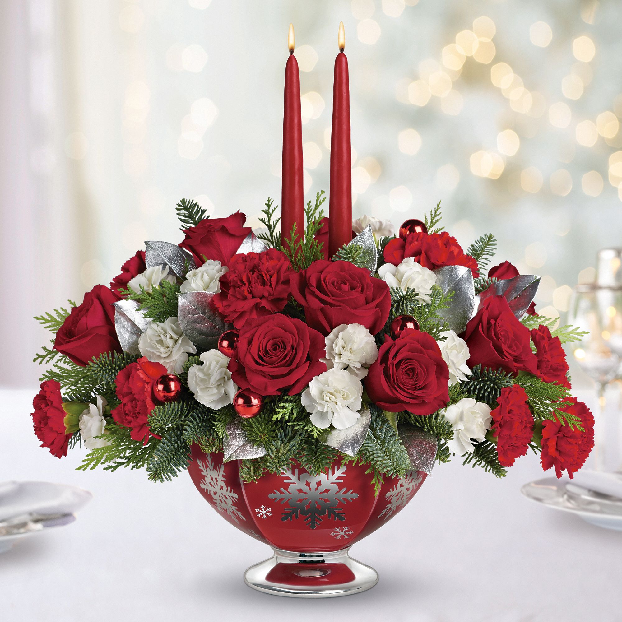 Elegant tapers glow warmly above this wondrous centerpiece of red roses and carnations, artfully arranged in a shimmering snowflake bowl. Hand-glazed, the food-safe ceramic piece will be a treasured serving dish and display piece for many winters to come!