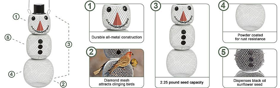 Without the use of plastic or wood components, the premium construction of the NO/NO® Snow Man Wild Bird Feeder stands up against squirrels and other small animals that may try to access birdseed. Birds visiting your yard will be happy that they’re not sharing their feast with other animals, which will keep them coming back to feed again and again!